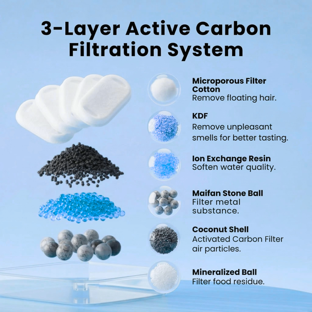 Felora™ uses a 3-layer active carbon filtration system designed to keep your cat’s water clean, fresh, and safe to drink throughout the day.